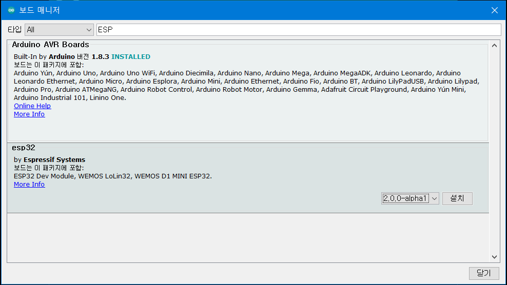 ESP를 검색하여 아래와 같이 ESP32를 설치해준다. 현재 릴리즈는 2.0.0이며, 가장 최신버전을 받아준다