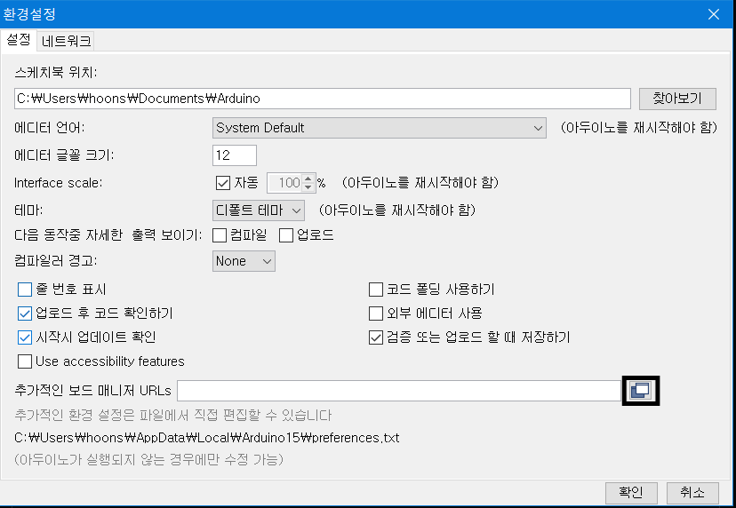 아두이노를 실행시켜 아래와 같이 파일-환경설정을 눌러준다.