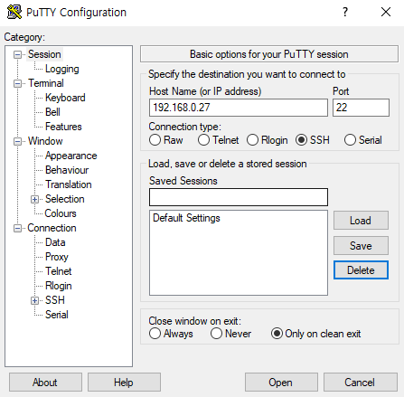 putty를 사용하여 라즈베이파이에 접속해줍니다.
