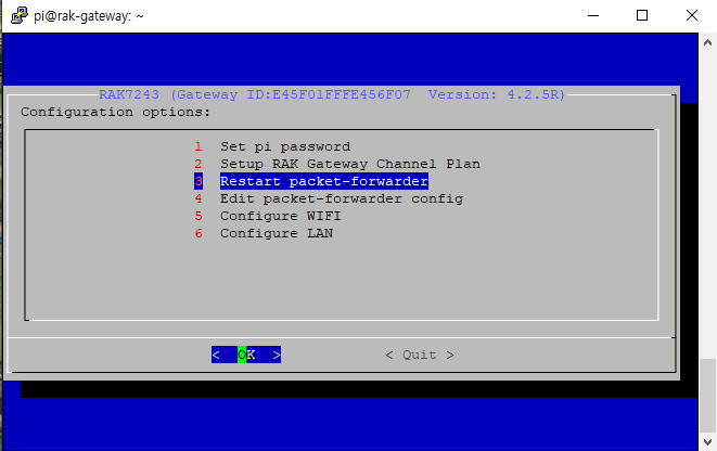 sudo gataway-config 를치면 게이트웨이 설정창이 나오면 상단의 게이트웨이 ID를 기억해둡니다.