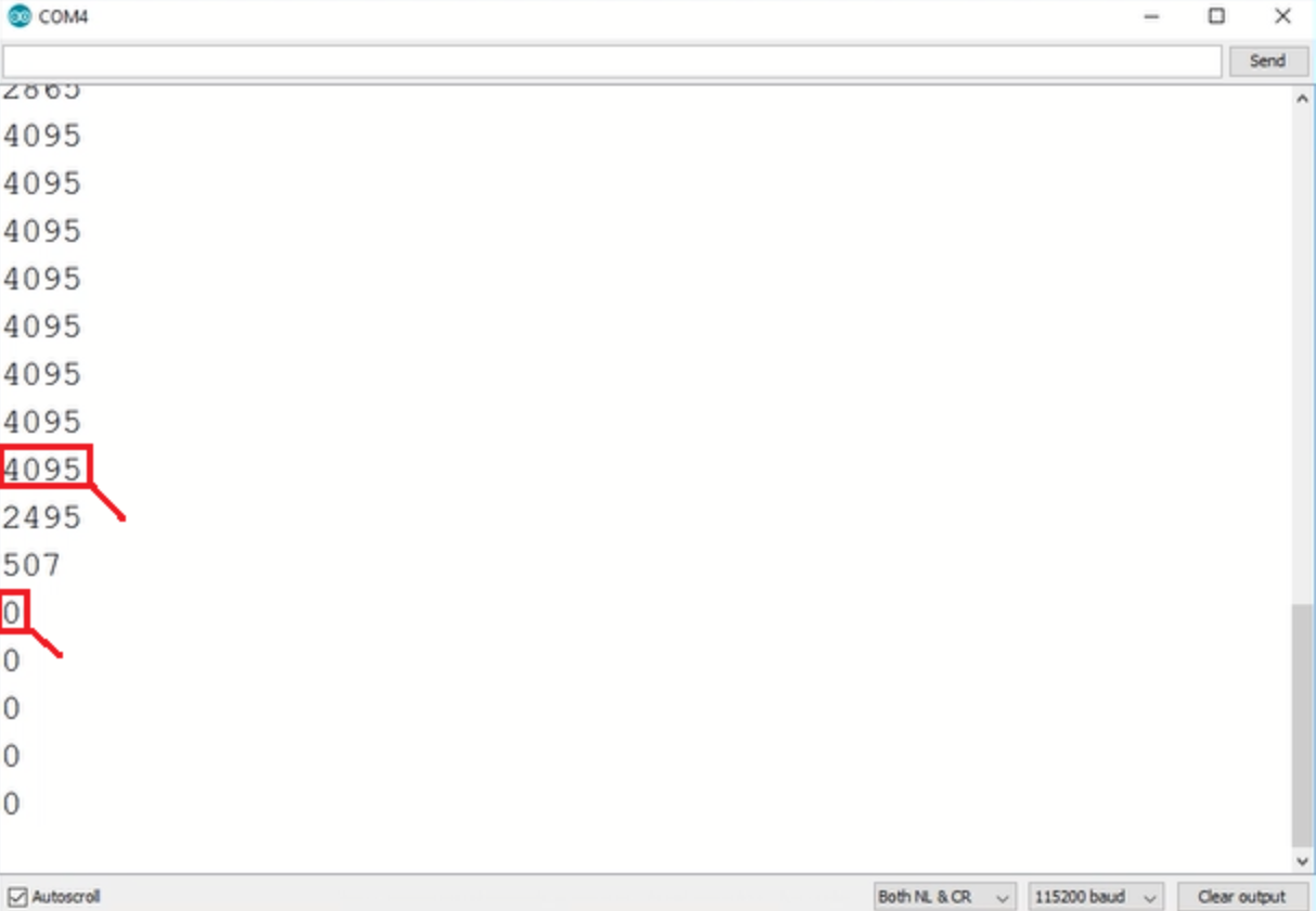 측정된 전압은 0~4095 사이의 값으로 출력됩니다. 0V는 0에 해당하고 3.3V는 4095에 해당합니다.